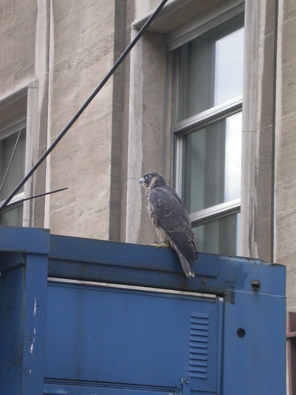 Jeune à l'envol, posé sur un container, côté Banque Nationale