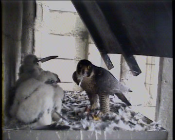 mâle avec une proie qu'il dépose devant les jeunes et la femelle s'en empare. Le