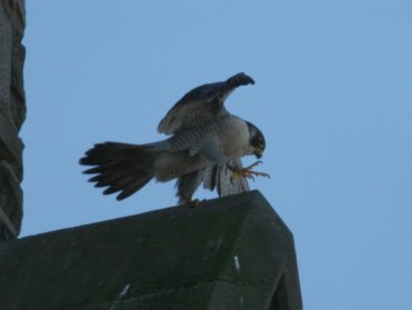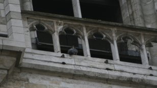 8h20 : le mâle se pose sur le clocheton de droite de la tour nord.