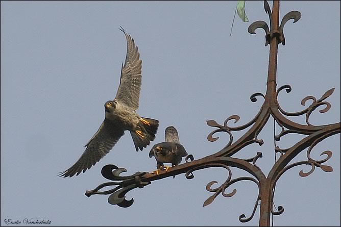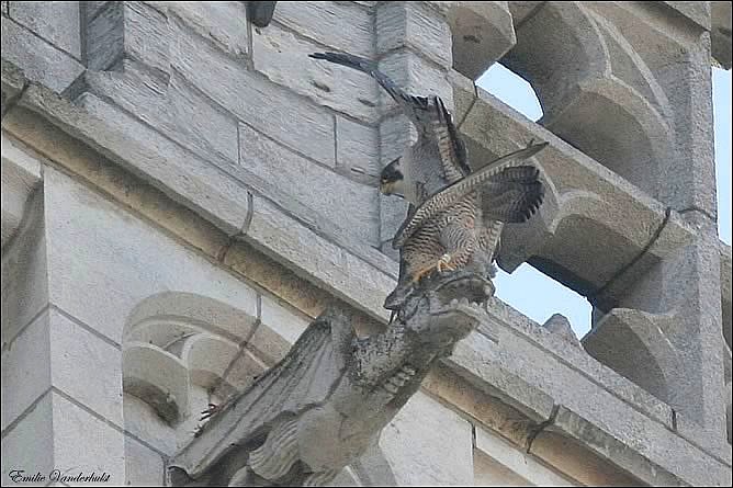 faucons pèlerins au sommet de l'église Saint-Hubert à Boitsfort,