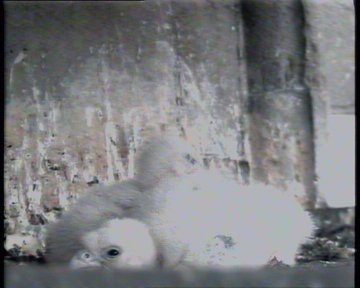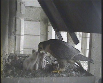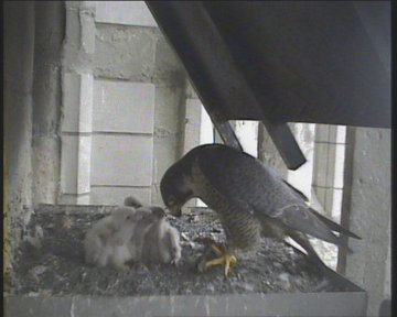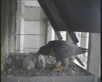 qui avaient quitté le site, sont arrivés. La femelle, posée sur le balcon, réclame la proie