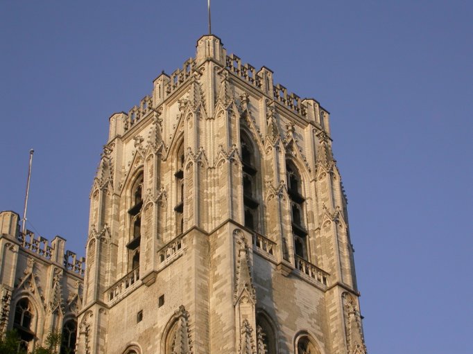 Op de kathedraal gebruiken de jongen de bovenste kantelen