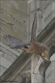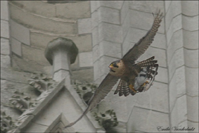 10h35: la femelle s'envole et se perche sur la tour de la cathédrale.