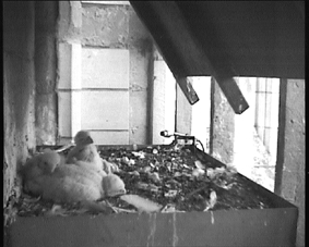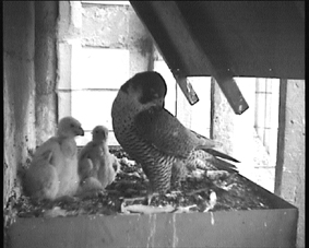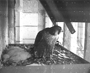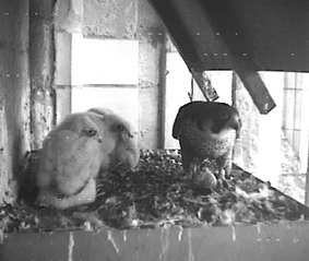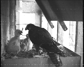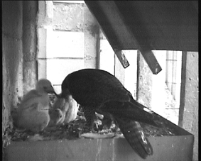 13h 02 à 13h25: la femelle ramène un pigeon et nourrit les 3 becs affamés