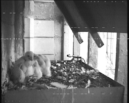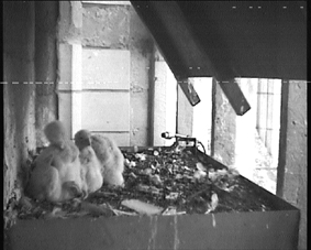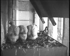A leur réveil, les petits faucons essayent de faire leur premiers pas ...et trébuchent. Éclats de rire des spectateurs ! |