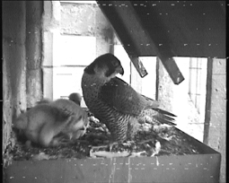 7h58: le mâle lance un appel et la femelle arrive avec un pigeon dans