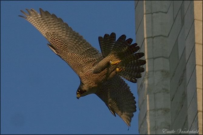 17h31: la femelle s'envole en direction des toits de la Banque Nationale et