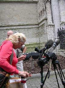 8h30:le mâle adulte arrive et L6 vole à sa rencontre, toujours en mendiant. L'adulte part vers la Grand-Place, suivi de Léontine qui continue à pousser des cris plaintifs. Elle vole fort bien mais ne suit pas l'adulte et fait un demi-tour pour revenir se poser au sommet de la tour Nord. Un de ses frères est sur la gargouille du bas et, à côté de lui, elle parait immense !